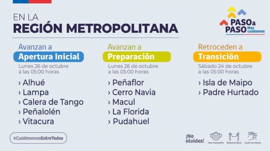 Todas las comunas anteriores avanzarán hacia la fase siguiente este lunes 26 a las 5 de la mañana.