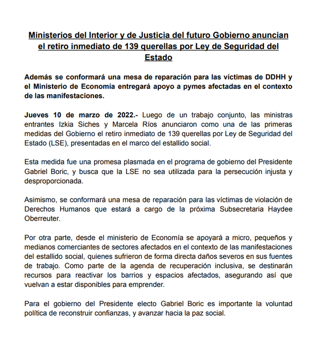 La medida, según informaron mediante un comunicado oficial, es una promesa plasmada en el programa del gobierno del presidente electo, Gabriel Boric, la cual tiene como objetivo que la LSE no sea utilizada para la "persecución injusta y desproporcionada".