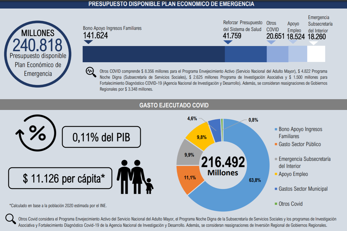 Un informe de la Contraloría General de la República revela que el Estado destinó $216.492 millones al plan para hacer frente al coronavirus. La cifra representa un 0,11% del PIB y un monto per cápita de $11.126, calculado con respecto a la población estimada del 2020 según el INE. El desglose del gasto indica que, del total, la mayor suma se empleó en financiar el Bono COVID.