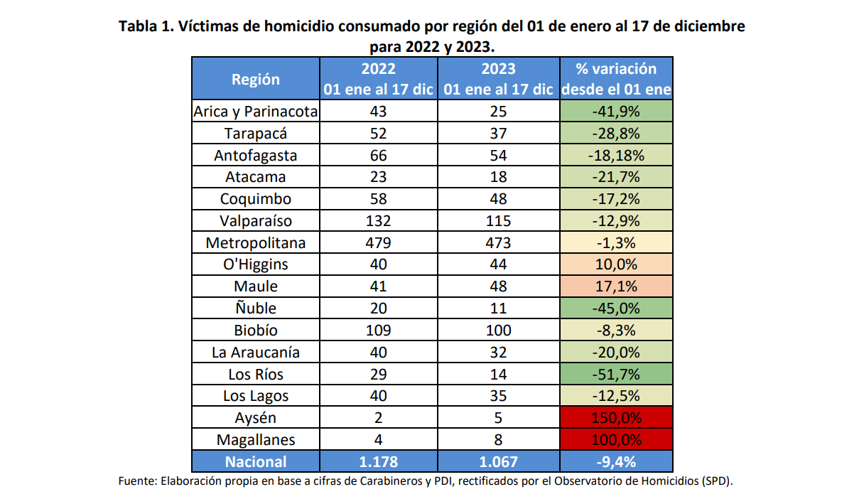 De acuerdo a las cifras ingresadas por Carabineros y la PDI a la plataforma del Observatorio de Homicidios de la Subsecretaría de Prevención del Delito, en los últimos 12 meses (hasta el 17 de diciembre) se reportaron 1.067 crímenes a nivel nacional.