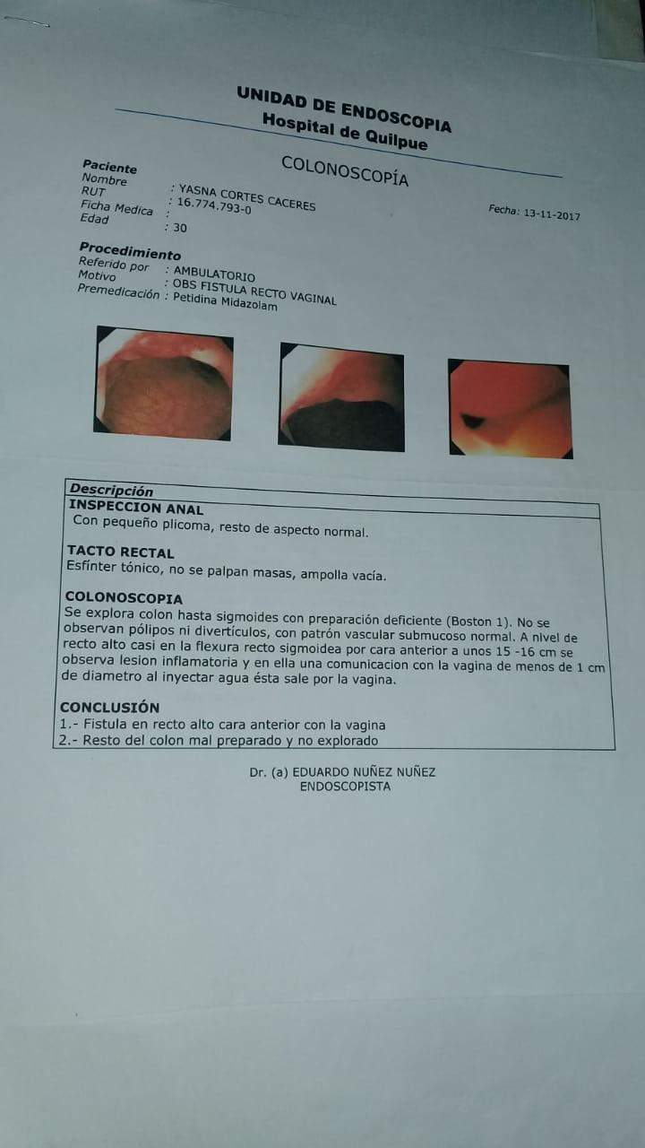 Con temor, Yasna confiesa que la complicación más grave, además de la incertidumbre de si podrá tener hijos nuevamente, es lo que sucede en su intestino grueso, ya que, de alguna manera, el corte y la misma operación le provocaron una inusual anomalía en su cuerpo que la obliga a expeler materias fecales por su vagina.