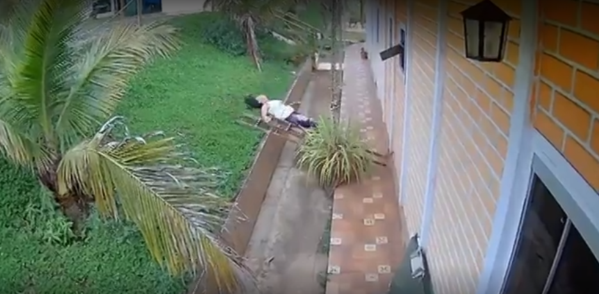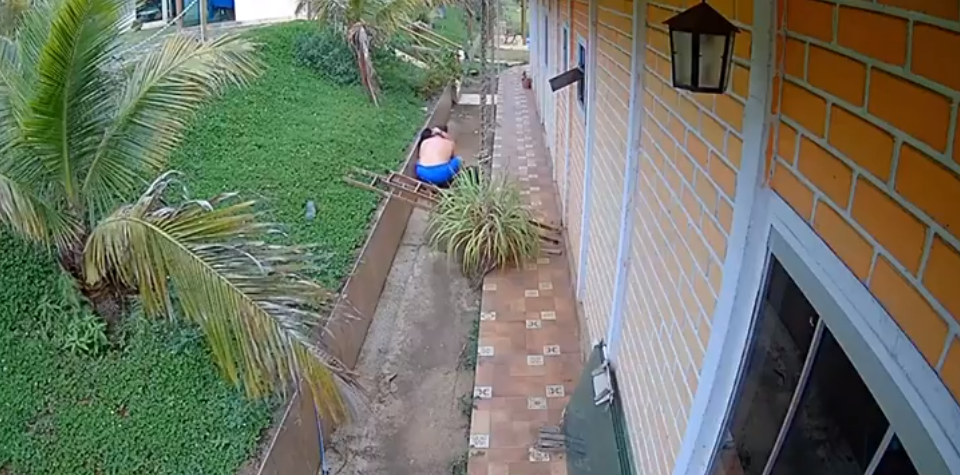 Según lo que se puede ver en las imágenes, la mujer llamada Kátia Regina de Carvalho cayó fuertemente desde la escalera que estaba apoyada en el techo su casa en Itaguara, Región Metropolitana de Belo Horizonte, Brasil, golpeándose fuertemente contra el suelo.