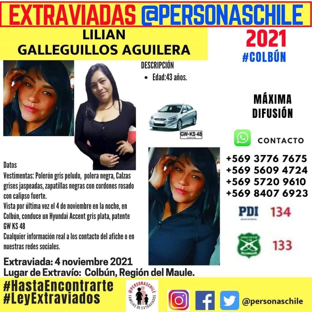Lilian Galleguillos Aguilera se extravió en la comuna de Colbún y conducía un auto Hyundai Accent de color gris plata, patente GX KS 48, el cual fue encontrado en un río a 1 hora de su casa, aproximadamente, según comentó su hermana, Leslie Galleguillos, a CHV Noticias.