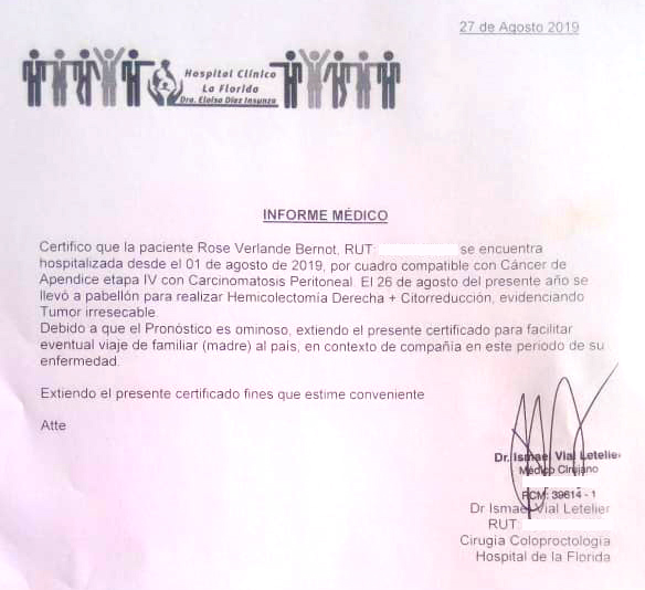 Rose Bernot, quien está desahuciada en el Hospital de La Florida, ingresó al recinto por una apendicitis, pero le detectaron un cáncer cuyo diagnóstico le da sólo tres semanas de vida. Hoy quiere ver a su familia y despedirse de ellos, pero Cancillería explicó que la llegada está condicionada a trámites que deben realizar en el Consulado Chileno.