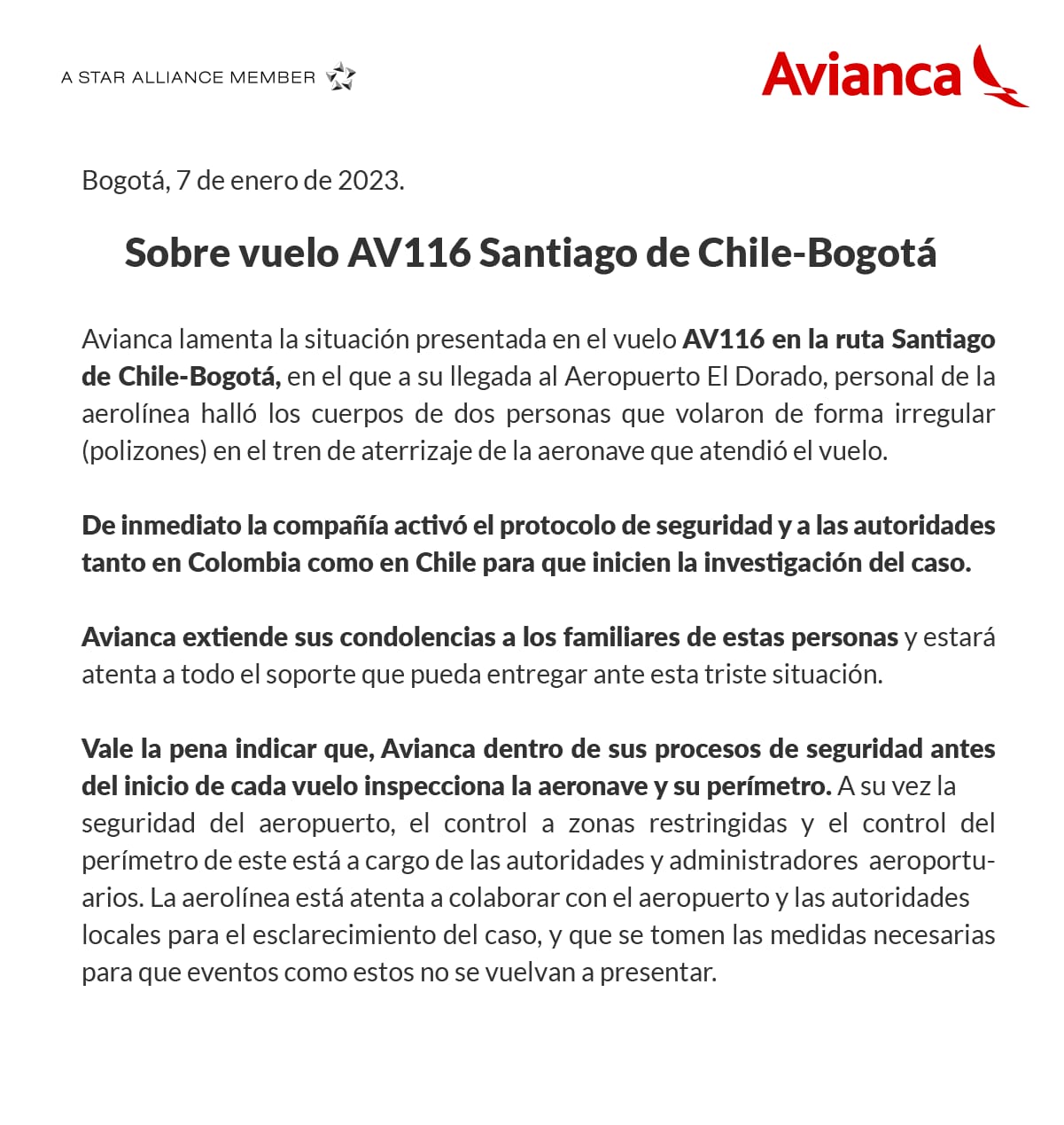 Desde Avianca indicaron que ambas personas iban viajando “de manera irregular” y que corresponderían preliminarmente a dos menores de edad (entre 15 a 20 años) afrodescendientes. Además, anunciaron que tanto las autoridades chilenas como colombianas iniciaron una investigación.