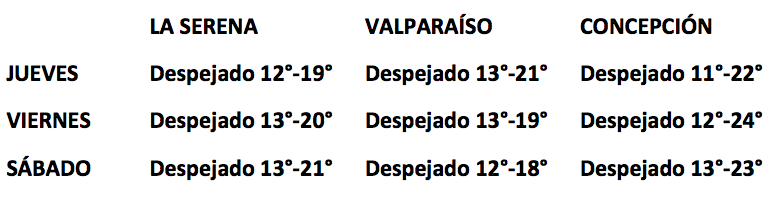 En general, el cielo se mantendrá despejado entre La Araucanía y el norte chico durante este fin de semana largo. Las temperaturas más altas se registrarán en los valles y la precordillera. En la costa también brillaría el sol, claro que luego de la típica nubosidad matinal, con vientos por las tardes de hasta 50 kilómetros.