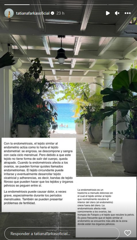 Tatiana Farkas compartió en su cuenta de Instagram una importante reflexión sobre cómo es vivir con endometriosis, una patología que afecta a los órganos femeninos del cuerpo (entre otros). "Quiero que otras mujeres y niñas no se sientan solas”, comentó.