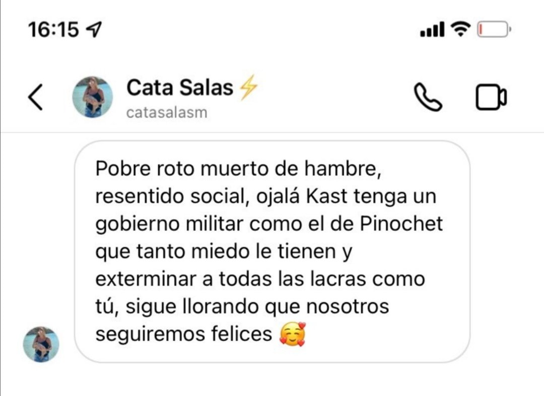 Según lo descrito por Catalina al medio “lo que pasó fue que yo subí una historia mientras estaba votando y me escribió una cuenta falsa, insultándome a mí, a mi papá, a mi mamá y a mi hermana Camila. Yo respondí, pero nunca insultando ni nada parecido, así que después bloqueé a esta persona y pensé que se había cerrado el tema, pero lamentablemente no fue así”.