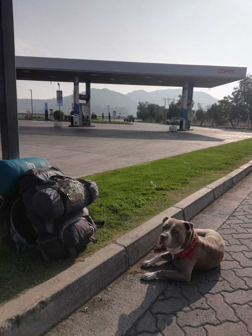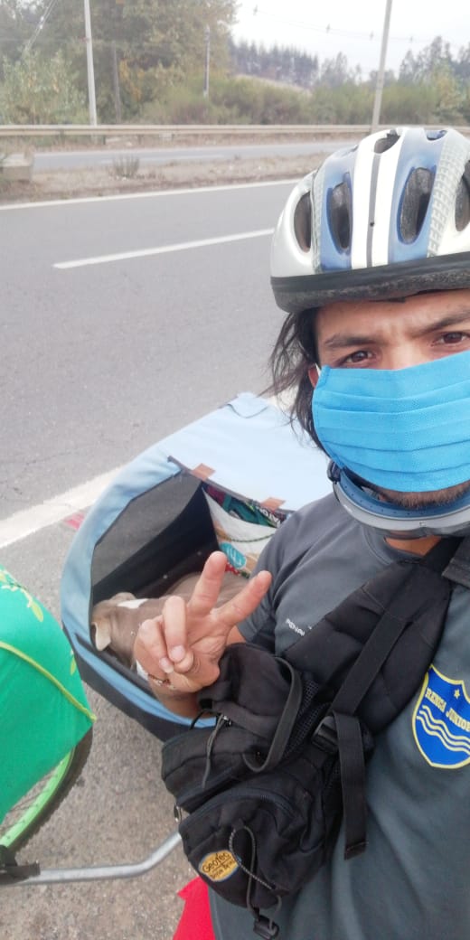 Lee también: Chile está entre los países sudamericanos con menos restricciones contra el COVID-19, según ranking de la U. de OxfordHaciendo dedo, el viajero y su mascota llegaron a Chillán y de la misma forma, a Curicó. Pasó una semana de descanso en la casa de un amigo, hasta que logró llegar a Santiago, siempre acompañado del pitbull. Allí se quedó donde una amiga de su familia, pero no pudo continuar mucho tiempo debido a que la dueña de casa tenía enfermedades de base. Finalmente, otra persona se enteró de su situación por redes sociales y los recibió en su casa en la comuna de Independencia: allí se encuentran actualmente.