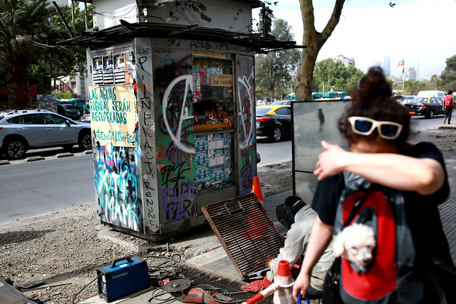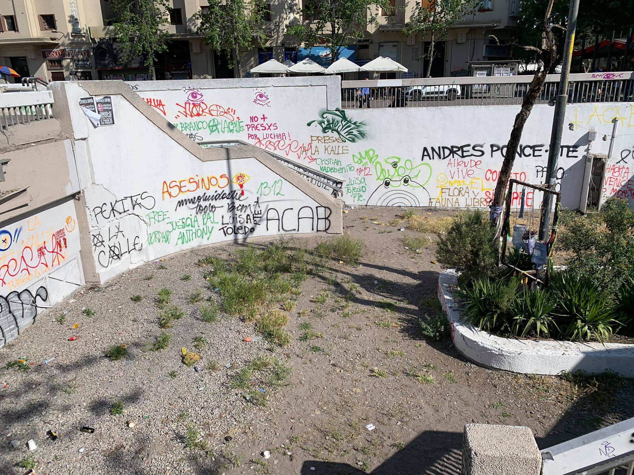 El acceso y salida principal de la estación Baquedano del Metro de Santiago sigue cerrada. Dentro de esas instalaciones se esconden hipótesis echadas por suelo y hasta la basura ha tomado su lugar en ese espacio que parece tan inerte si no fuese por los grafitis.
