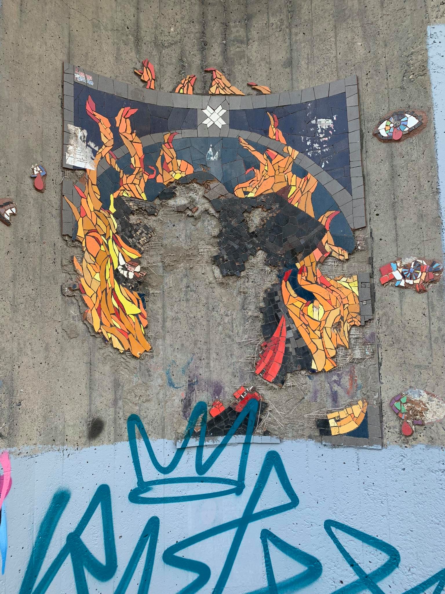 Restos de un mosaico del famoso "Matapacos", aquel perrito negro con bandana roja atada al cuello que fue alzado como un símbolo del 18-O, muestran el paso del tiempo y lo que, al parecer, algunos ya no quieren ver.