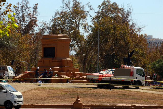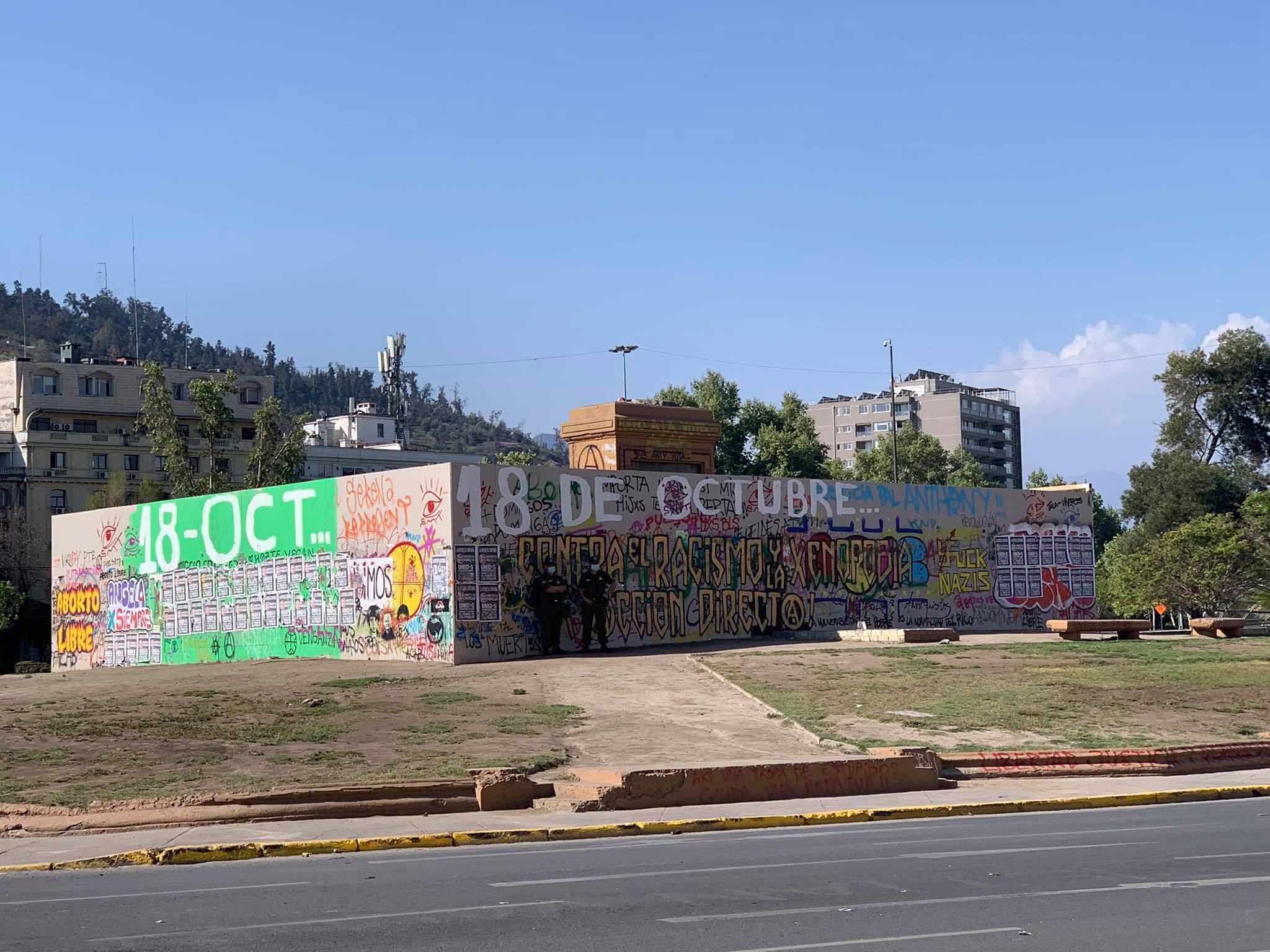 Hoy la Plaza de la Dignidad, como popularmente se le sigue denominando, luce muy diferente a ese 18 de octubre de 2019. Carabineros resguardan el perímetro donde se emplazaba la estatua y murallas originalmente blancas rodean la estructura.