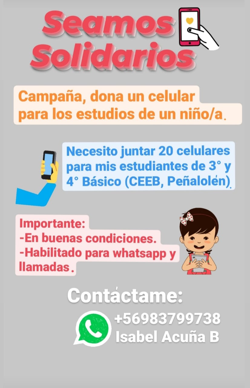 Ante esta situación se le ocurrió la campaña que continuará pese a que la comuna entra en Cuarentena este jueves: "Yo voy a seguir, hago un llamado a todas las empresas, Entel, Movistar, WOM, Claro... ¿qué hacen con los celulares que no venden, los que están pasados de moda? Los necesitamos en las escuelas, porque si no esto va a seguir y cada vez vamos a tener una brecha educativa más grande y amplia".