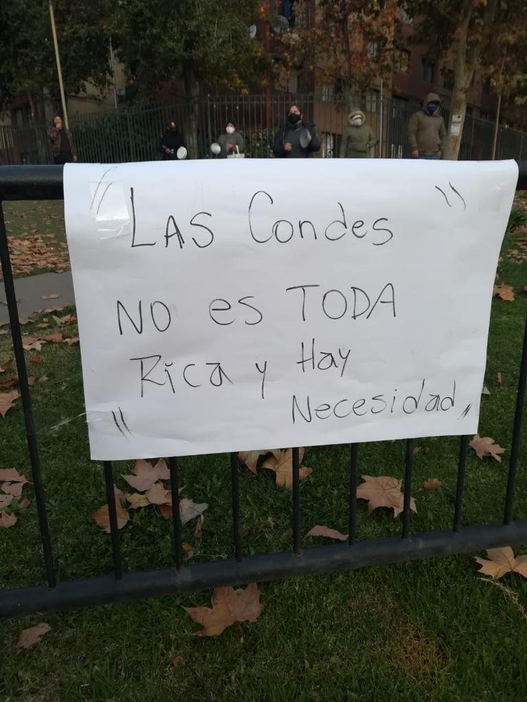 “En Las Condes la pobreza se esconde”. Este es uno de los mensajes que se puede leer en los lienzos y carteles que exhiben quienes participan de una manifestación en esa comuna del sector oriente de la capital.