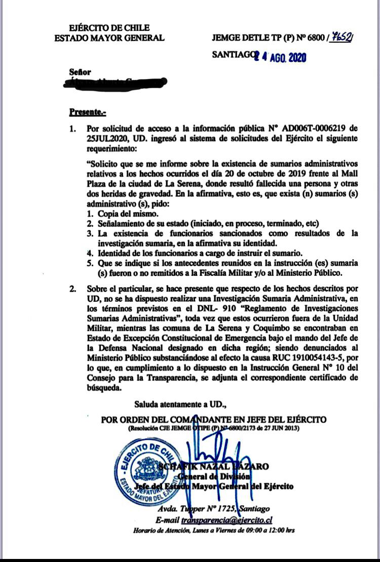 En la imagen se aprecia el documento, firmado por el General de División del Estado Mayor del Ejército, Schafik Nazal Lázaro, por orden del comandante en Jefe. Por medio de este, la institución respondió a la parte querellante en la causa de Romario Veloz. Ahí se expresa que la decisión de no iniciar un sumario administrativo se debe a que "toda vez que estos ocurrieron fuera de la Unidad Militar, mientras las comunas de La Serena y Coquimbo se encontraban en Estado de Excepción Constitucional de Emergencia bajo el mando del Jefe de la Defensa Nacional designado en dicha región".