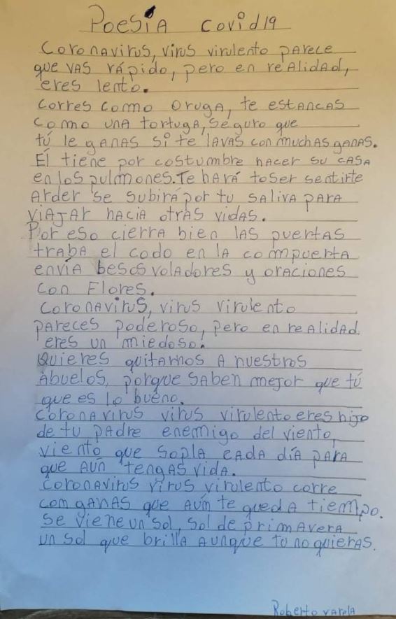 Así parte la poesía escrita por Roberto Varela, niño de 12 años autor del texto que se hizo viral en redes sociales y que postula al concurso del Departamento Administrativo de Educación Municipal (DEAM) de Osorno, llamado Festival de las Artes desde Casa.
