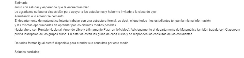 Matthei señaló luego en otro mensaje: "Benjamín, he conversado el tema y los equipos directivos y profesores estarán atentos a sus inquietudes. Siéntanse con la libertad de escribirles, dado que ellos siguen trabajando. No es un sistema perfecto y estamos viendo correcciones y mejoras para ustedes y su educación".