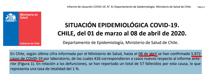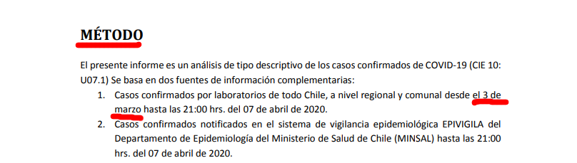 Esto no aclara el período de referencia, pues no explicitan una fecha de inicio, no establece si lo determinan según el diagnóstico el primer caso en la zona aludida o si utilizan el parámetro nivel país. Recién en el informe detallado por comuna, emitido el 8 de abril, lo definen con claridad y fijan la fecha de inicio el 3 de marzo.