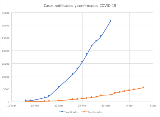 Este gráfico muestra la enorme brecha entre los casos notificados y los confirmados.