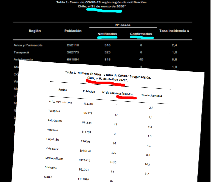 En todo caso, esta nebulosa se volvió menos clara a partir del 1 de abril cuando el Minsal dejó de consignar en sus informes el dato de los casos notificados por los médicos. Aquí vemos como esa columna desapareció como antecedente.