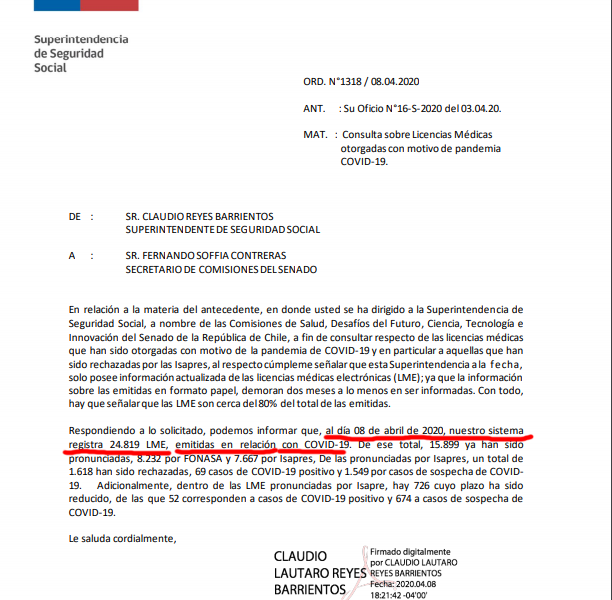 Pero este otro documento, remitido por la Superintendencia de Seguridad Social a la Comisión de Salud del Senado difiere con las cifras del Minsal: “al día 08 de abril de 2020 nuestro sistema registra 24.819 LME (Licencias Médicas) emitidas en relación a COVID-19”.