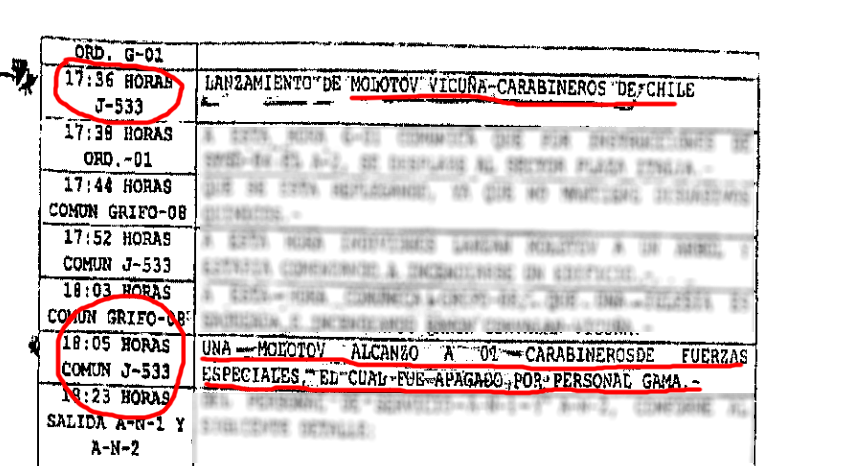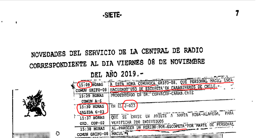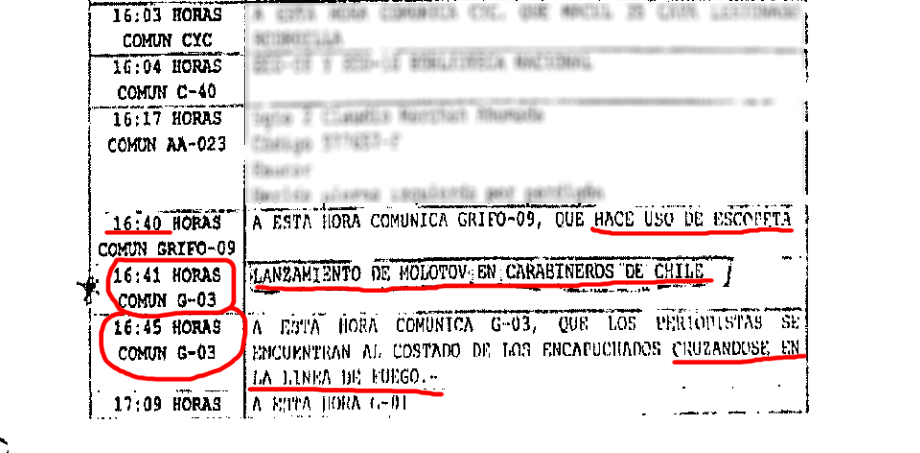 El registro de los contactos radiales entre los efectivos de FF.EE. es parte del sumario e indica que los incidentes en calle Carabineros de Chile comenzaron a eso de las 15:00 horas. Hay constancia, según la carpeta, que ya en ese minuto había efectivos que usaban sus escopetas antidisturbios contra los manifestantes.