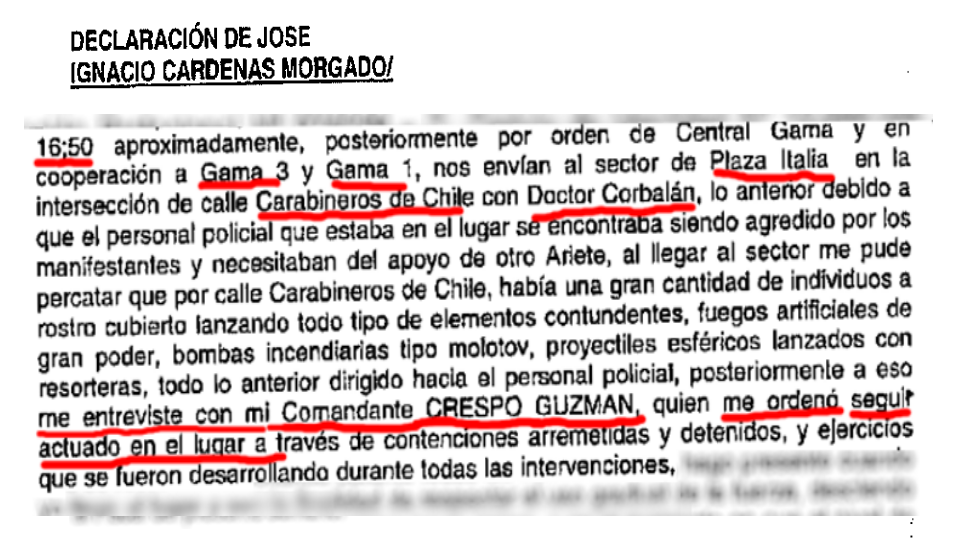 En su declaración, el capitán Cárdenas Morgado recuerda que, al llegar a Carabineros de Chile con Doctor Corbalán, observa una gran cantidad de encapuchados que lanzaban todo tipo de proyectiles contra los funcionarios y que ahí se entrevista con el comandante Claudio Crespo Guzmán, teniente coronel y subprefecto de FF.EE. que responde a la clave policial GAMA-3.