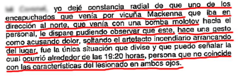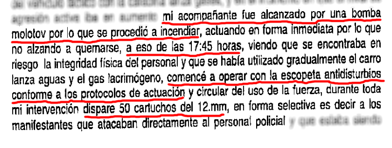 El capitán dice que respetó los protocolos de disparo “apuntando siempre a la parte baja del cuerpo y a una distancia superior a los 30 metros”. También reconoce que pudo herir a uno de los manifestantes, de lo cual, asegura, dejó una constancia radial. Esto habría ocurrido a las 19:20.