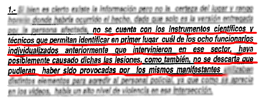 El fiscal consideró imposible determinar que fueron perdigones disparados por funcionarios de la institución los que dañaron los ojos de Gustavo Gatica, menciona incluso que pudieron ser los manifestantes quienes lo dejaron ciego.