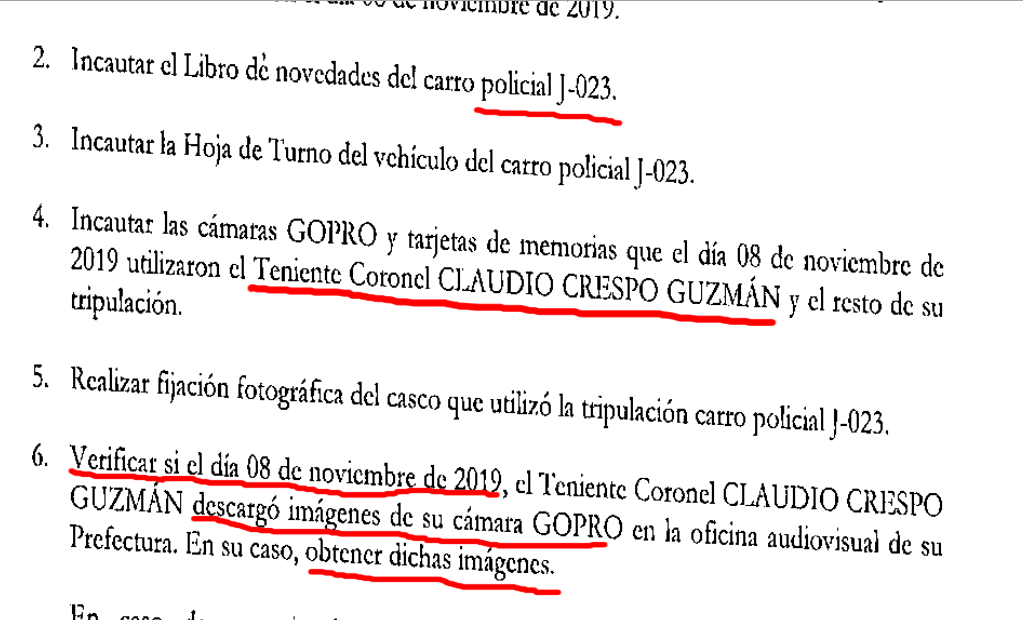 El subcomisario Cristián Lizama, a cargo de la investigación, debía incautar el certificado de servicio del carro policial J-023, identificar a su tripulación, la munición asignada y las especies fiscales que los funcionarios utilizaron el 8 de noviembre de 2019 y, en específico, requisar la cámara que utilizó el teniente coronel Claudio Crespo Guzmán, además de las tarjetas de memoria y verificar si el aludido oficial descargó imágenes desde su cámara GoPro en la oficina audiovisual de la prefectura.
