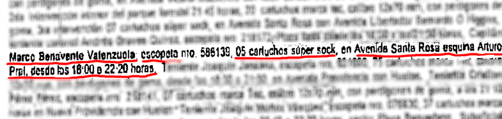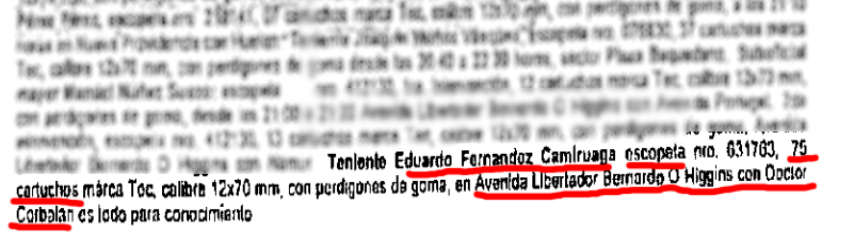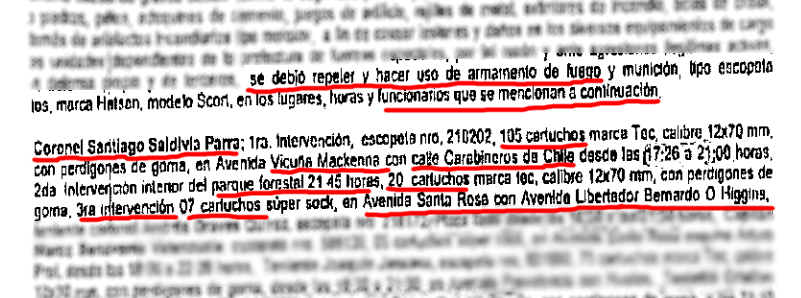 El parte aludido menciona que este oficial estuvo en la intersección de Vicuña Mackenna con Carabineros de Chile entre las 17:26 hasta las 21:00 horas y que disparó 105 tiros de escopeta. Luego utiliza su arma en el Parque Forestal y más tarde en Alameda.