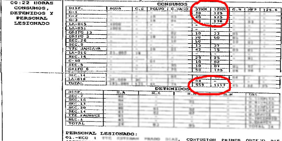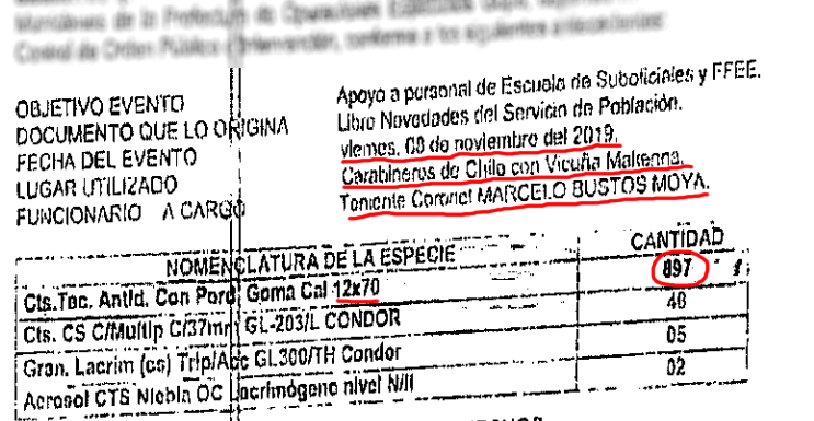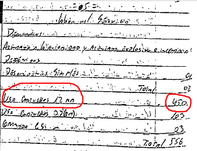 Más adelante, detalla la cantidad de insumos utilizados en la represión de la protesta. Llama de inmediato la atención la cantidad de tiros de escopeta percutados. Se indica que fueron 450 cartuchos de 12mm. Este oficial no fue parte del sumario de carabineros.
