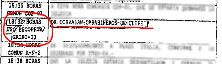 El próximo comunicado radial que consigna el informe de FF.EE. ocurre a las 18:32 minutos y entrega, aparte del horario, tres datos: “Uso de escopeta, GRIFO-3; Doctor Corbalán-Carabineros de Chile”.