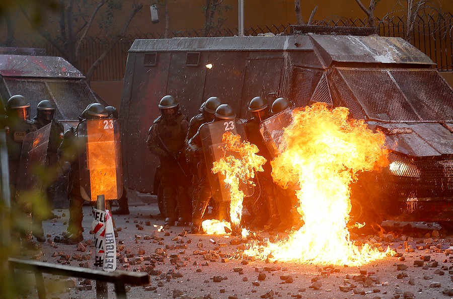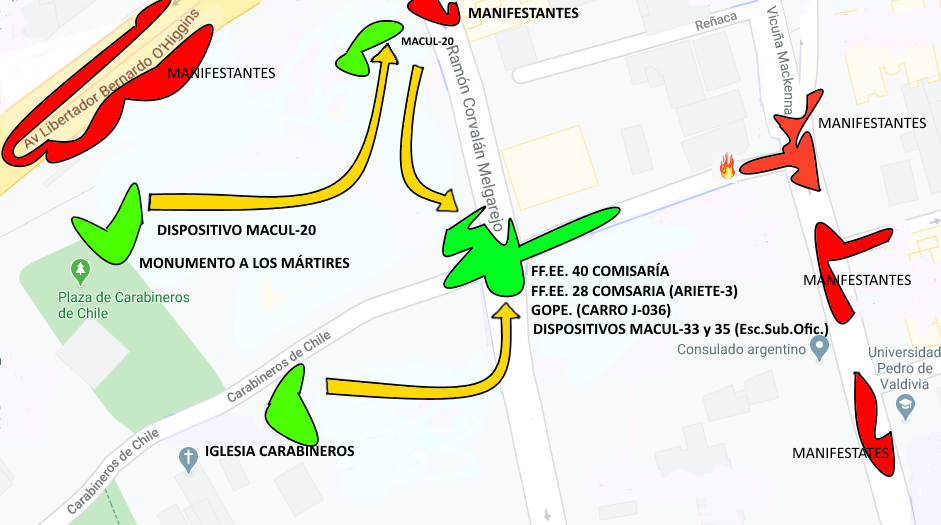 Esta respuesta del general explica por qué confluyeron en el lugar tantos efectivos y por qué la férrea defensa para impedir el paso de los manifestantes a esa zona. Ese día, anarquistas desmantelaron el mobiliario de la parroquia de La Asunción, ubicada a pocas cuadras, y quemaron en la calle bancas e íconos religiosos. Desconocidos también prendieron fuego a la sede de la Universidad Pedro de Valdivia, por lo que el monumento de Carabineros y su iglesia institucional obviamente eran blanco de los manifestantes más radicalizados. Es de suponer que el Alto Mando tenía eso bastante claro, por lo que concentró en la zona un fuerte contingente para proteger sus “símbolos institucionales”.