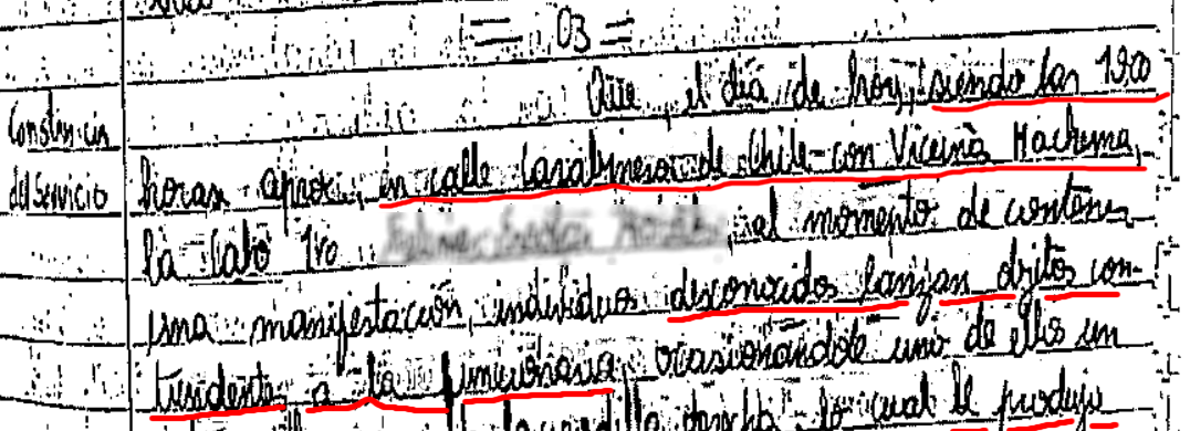 En un documento manuscrito donde da cuenta de las novedades del servicio de ese día, Villagra Soto detalla que se hace uso de la escopeta, granadas de mano (lacrimógenas), cartuchos de 37mm (lacrimógenas) en el sector de Doctor Corbalán y que su unidad se repliega hasta la intersección de calle Carabineros de Chile. Destaca que, en el lugar, colaboraron también FF.EE. y personal del GOPE en la contención de los manifestantes.