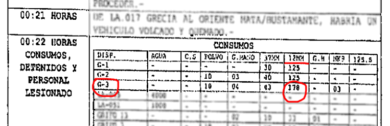 La bitácora que da cuenta de los diálogos efectuados a través de los transmisores portátiles que usan los efectivos detalla que a las 15:30 horas salió de la unidad de Fuerzas Especiales el carro J-023 al mando de G-3 o GAMA-3, en clave policial. Este es uno de los oficiales que figura solicitando cooperación en el sector, según el testimonio del capitán Cárdenas Morgado.