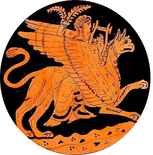 El grifo se representa con cabeza de águila, sus patas delanteras culminan en dos poderosas y afiladas garras y su cuerpo inferior es el de un musculoso león de pelaje amarillo. Apolo, el dios griego, cabalga en su lomo.