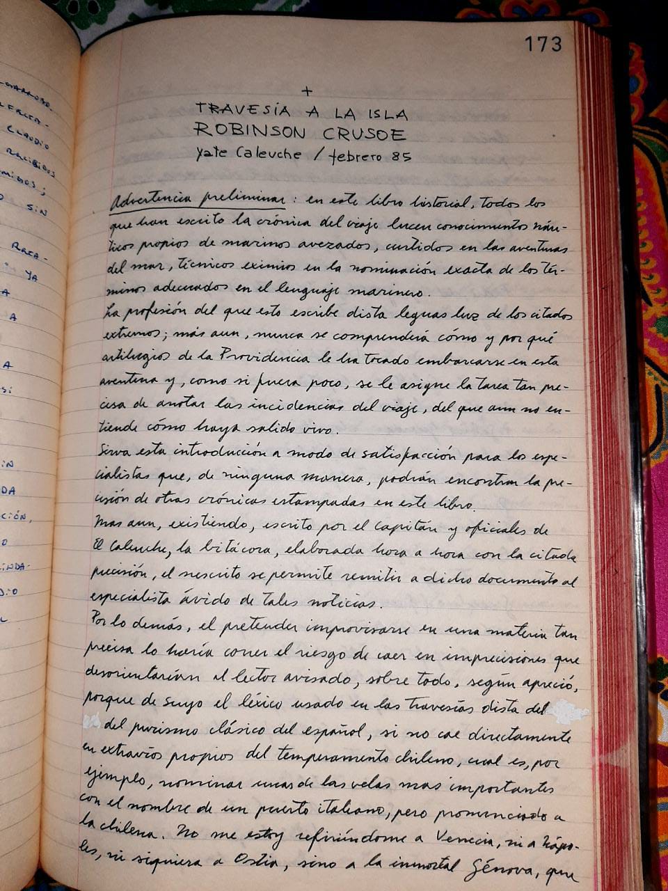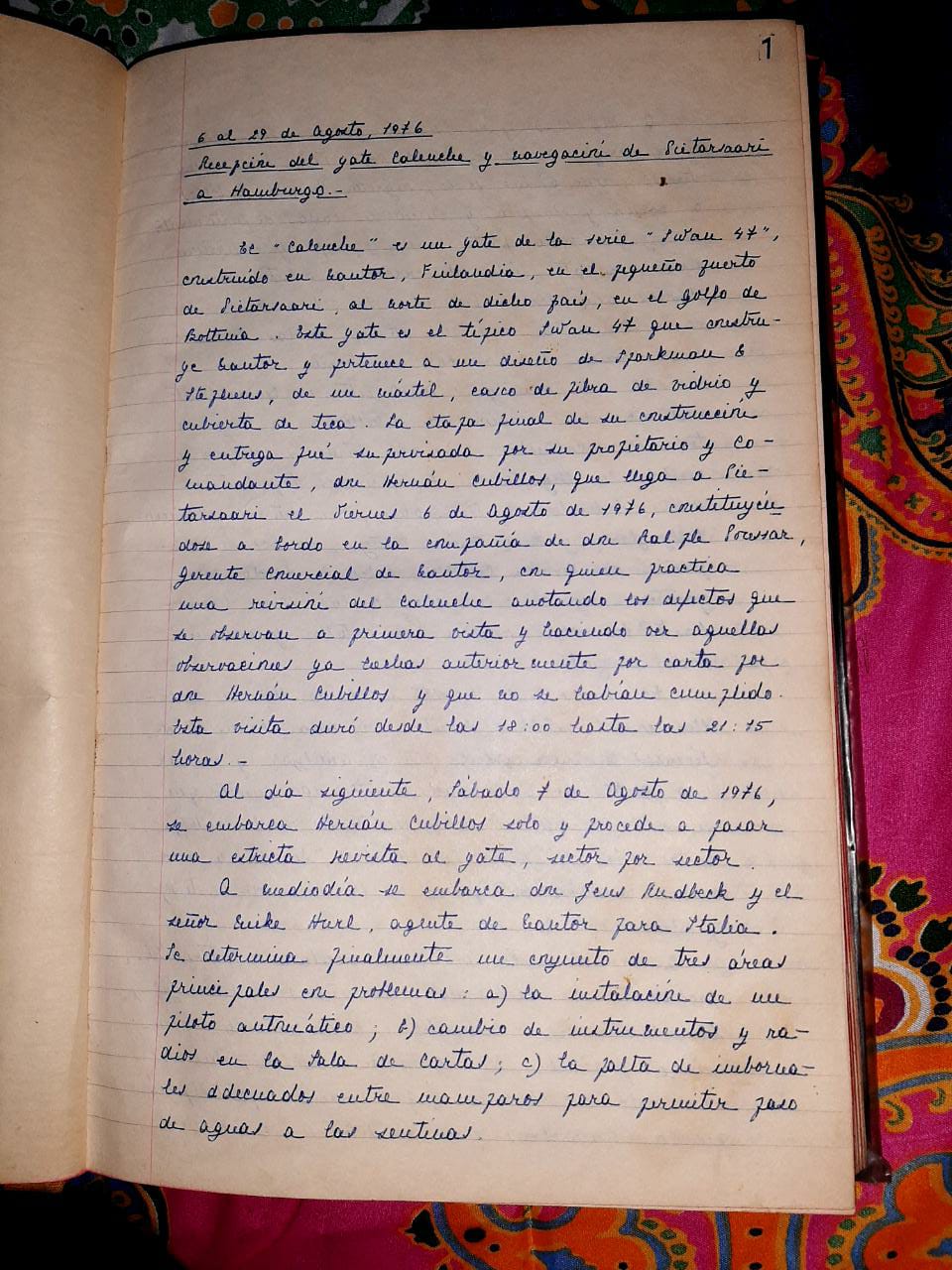 En su biblioteca guarda dos libros. Uno es la bitácora del yate “El Caleuche”, que fue propiedad del ex teniente de la marina y ex ministro de Relaciones Exteriores de la dictadura de Pinochet (1978-1980), Hernán Cubillos Sallato. El otro, una carpeta con varios recortes de la época, extraídos de diversas revistas que publicaban noticias respecto a las travesías de este navío.