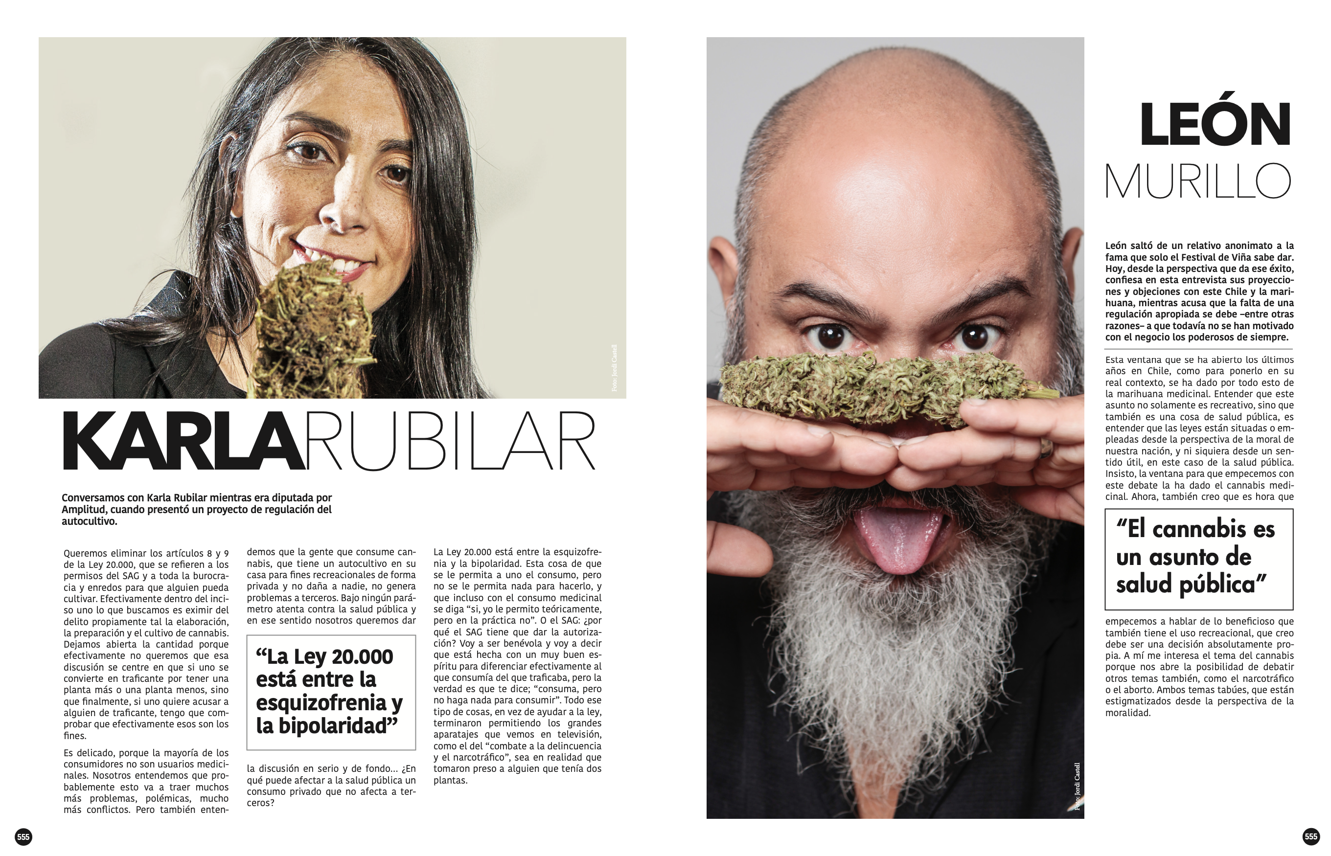 Cuando se habla de esta revista como rupturista y polémica una de las razones es que sus entrevistados posan con algo relacionado a la cannabis. El ex candidato presidencial, José Antonio Gómez, con un cogollo en su mano junto a la Constitución. La ahora Ministra de Desarrollo Social, Karla Rubilar, o el actual Ministro de Salud, Enrique Paris, han sido algunos de los entrevistados que han provocado repercusión.