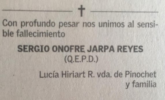 El 2020 no hay registro de nuevas recaídas que hayan significado su traslado al Hospital Militar, pero en abril dio una señal al publicar en los obituarios del diario El Mercurio un pésame por la muerte de Sergio Onofre Jarpa, el otrora líder de la derecha que fue ministro del Interior de la dictadura y que murió el domingo 19 de ese mes a causa del coronavirus. Lucía sobrevivió para despedirlo.