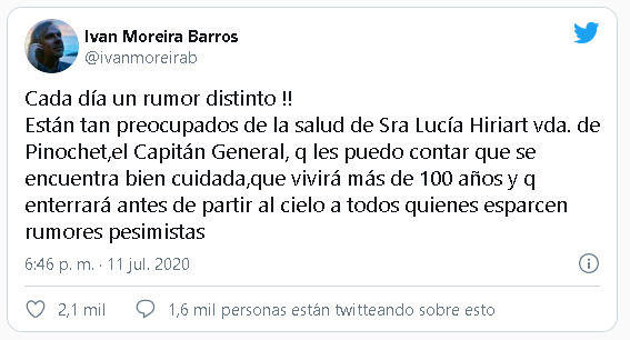 Pero todo estalló de nuevo el 11 julio, en plena pandemia, cuando comenzó a correr el rumor acerca de su muerte en redes sociales, rumor que se convirtió rápidamente en tendencia viral. La noticia fue desmentida por el senador Iván Moreira, uno de los pocos políticos de derecha que se ha mantenido fiel a la familia Pinochet y que mantiene vivo su aprecio y lealtad con la viuda.