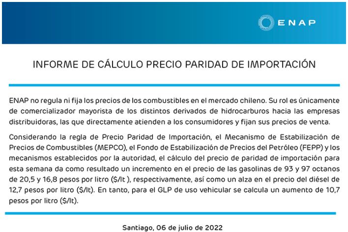 Según las razones que entregó la cartera de Mario Marcel, el MEPCO "funciona en base a varios parámetros establecidos en su normativa que incorpora cálculos de precio base, precios históricos, costos y fletes, impuestos, y banda de referencia de acuerdo al precio de paridad estimado por la Comisión Nacional de Energía, todos los cuales en esta oportunidad y debido al aumento inédito del dólar en un plazo tan corto, ha provocado que el precio de paridad ajustado haya quedado fuera del ámbito de aplicación de la banda".