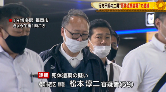 Matsumoto fue detenido la mañana del 5 de julio en el estacionamiento de un hotel en Kioto. El arresto fue por la sospecha de abandonar un cadáver, sin embargo, el detenido admitió las acusaciones.