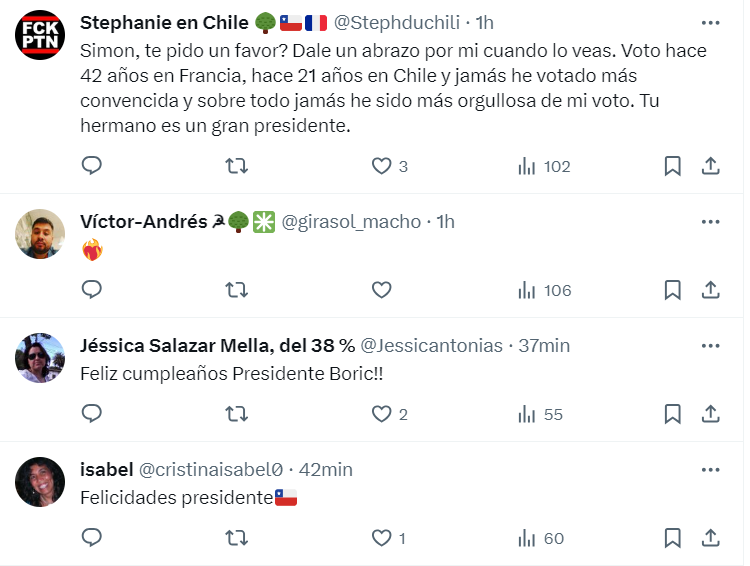 "Dale un abrazo cuando lo veas (...) Tu hermano es un gran presidente", "¡Feliz cumpleaños, Presidente Boric!", "¡Felicidades presidente!", fueron tan sólo algunos de los comentarios que fueron en la misma línea de Simón.