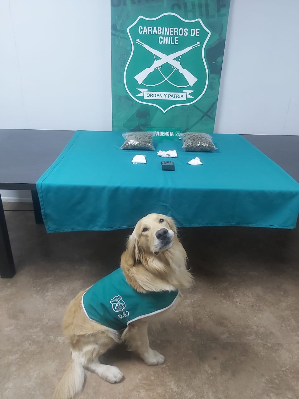 Todo ocurrió la noche del lunes, cuando personal policial de Rancagua fiscalizaba a los pasajeros del vehículo. En el procedimiento, el can marcó el bolso del individuo al olfatear olor a drogas en su interior.