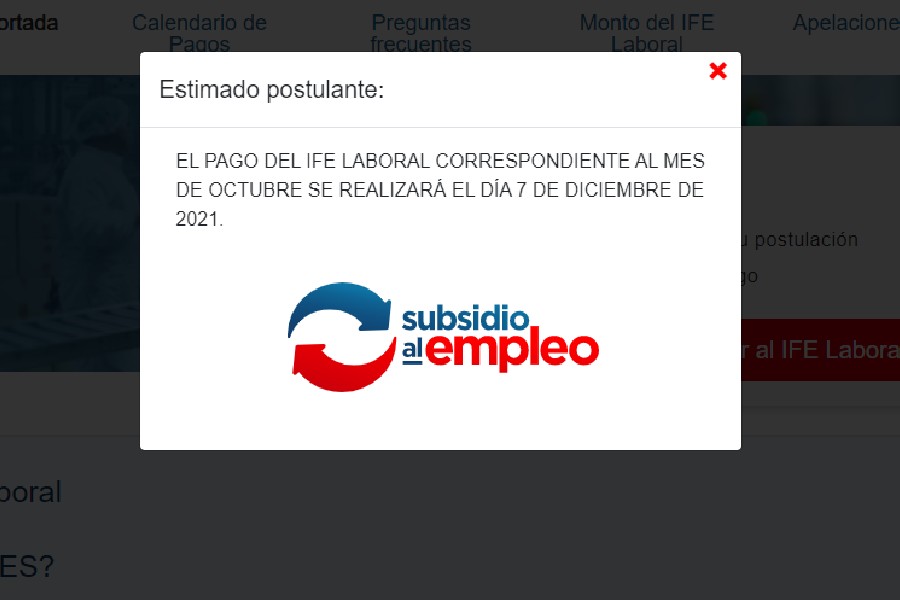 Pinchando las secciones mencionadas, se genera un cuadro en pantalla en que se señala: "El pago del IFE Laboral correspondiente al mes de octubre se realizará el día 7 de diciembre de 2021".