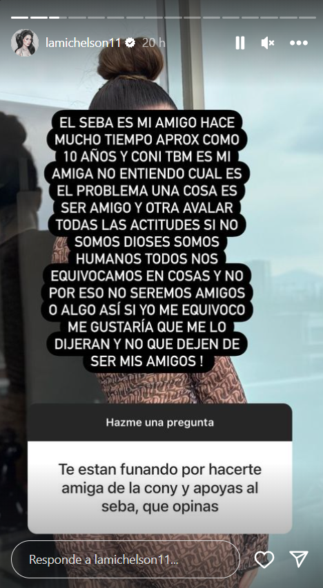 Dentro de una dinámica de preguntas y respuestas, un seguidor le consultó su opinión sobre las críticas de la gente tras la polémica y ella señaló: "El Seba es mi amigo hace mucho tiempo, aproximadamente como 10 años y Coni también es mi amiga. No entiendo cuál es el problema". En esa misma línea, la ex jugadora fue tajante y añadió: "Una cosa es ser amigo y otra avalar todas las actitudes, si no somos dioses, somos humanos. Todos nos equivocamos en cosas y no por eso no seremos amigos o algo así. Si yo me equivoco, me gustaría que me lo dijeran ¡Y no que dejen de ser mis amigos!". La imagen que desató los cuestionamientos de los seguidores de Gran Hermano, tenía como descripción "Levantadores de rating" y la borraron rápidamente tras las críticas, considerando la relación que Constanza Capelli y él tuvieron dentro del encierro, donde él evitó despedirse de ella cuando renunció.