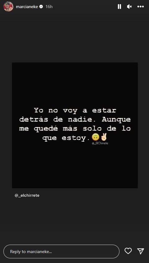 La relación entre Ignacia Michelson y Marcianeke es confusa y una incertidumbre para los seguidores del cantante y la influencer. Si bien Marcianeke ha dado a entender en varias ocasiones que está soltero, hay veces en que las publicaciones que hace en sus redes sociales siembran la duda. Eso fue lo que pasó durante el pasado sábado. A través de su cuenta de Instagram, el artista urbano publicó una historia con un registro de su canción Ella me Llamacuyo video son apasionados y románticos momentos entre la aparente ex pareja. Junto con la publicación de ese video, el músico insertó un sugerente emoticón que algunos han interpretado como una evidente inderecta a la influencer. Además, luego de unas horas, el joven publicó otra historia con una frase que dice "yo no voy a estar detrás de nadie, aunque me quede más solo de lo que estoy", lo que encendió más aún las dudas sobre el sentido de subir ese video. Hay que recordar que la última vez que se vio juntos a los tórtolos fue durante los premios de La Junta en diciembre de 2022, momento en que se sabía que ya no tenían una relación, pero que dejó una ola de reacciones por las coquetas fotos que ambos subieron a sus cuentas de Instagram. Además, el 11 de enero de este año Marcianeke cumplió 21 años y la influencer le dejó un coqueto mensaje que decía "Feliz cumpleaños, Marcianeke. Pórtate como se debe, pésimo". Hasta ahora, Ignacia Michelson no ha publicado nada que pudiera sugerir una interacción con el cantante.