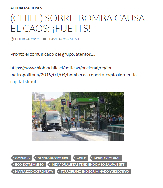 A través de un sitio web, el grupo eco terrorista “Individualistas Tendientes a lo Salvaje” se habría adjudicado este atentado explosivo, detallando que revelarán un comunicado dentro de las próximas horas.