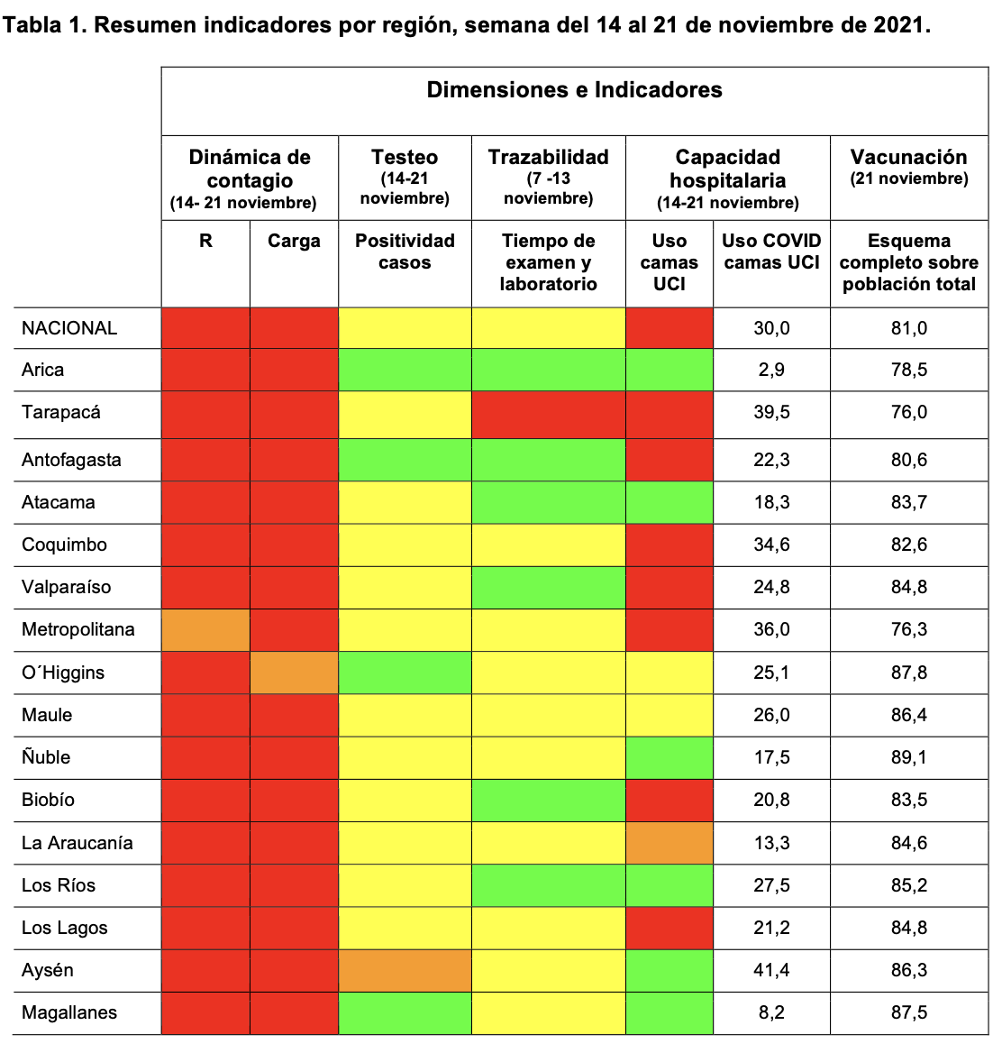 Lee también: Preocupación internacional: Nueva variante de COVID-19 detectada en Sudáfrica llegó a EuropaAún así, en la dimensión de capacidad hospitalaria, el nuevo reporte señala que la ocupación promedio de camas UCI a nivel nacional (por cualquier patología) alcanzó un 89,8% en la semana observada, manteniéndose en color rojo del semáforo ICOVID desde mediados de octubre.